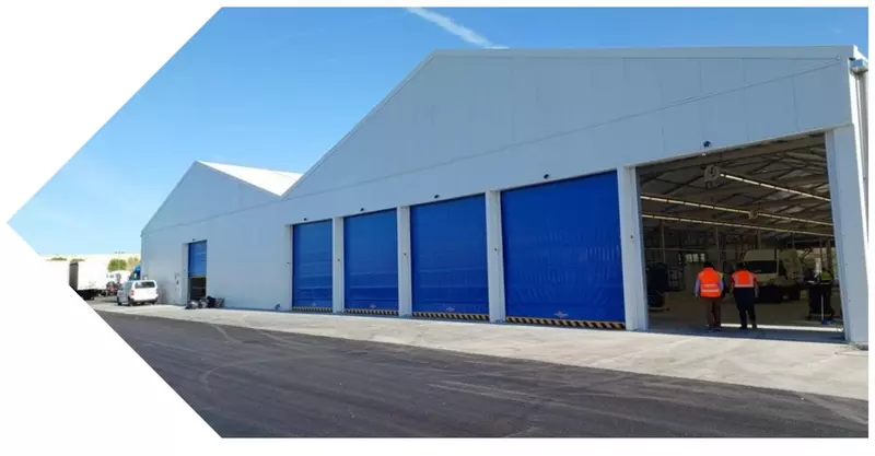 Un chapiteau de stockage peut être équipé de portes techniques, sas de manutention, éclairage, ventilation, planchers techniques et systèmes de sécurité pour répondre aux besoins spécifiques de stockage et d’exploitation.