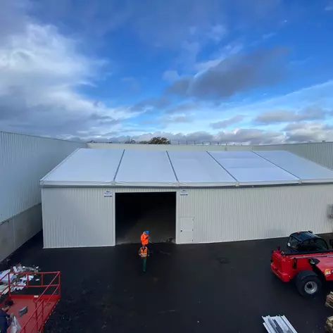 Pour l’extension et donc le second bâtiment, le client a opté pour un auvent, ouvert sur un long-pan et son pignon arrière. Long de 35m, celui-ci ajoute donc 630m² de surface de vente couverte supplémentaire au magasin.